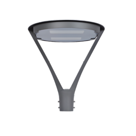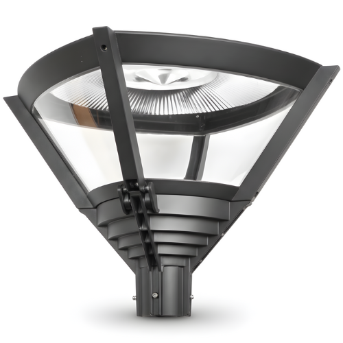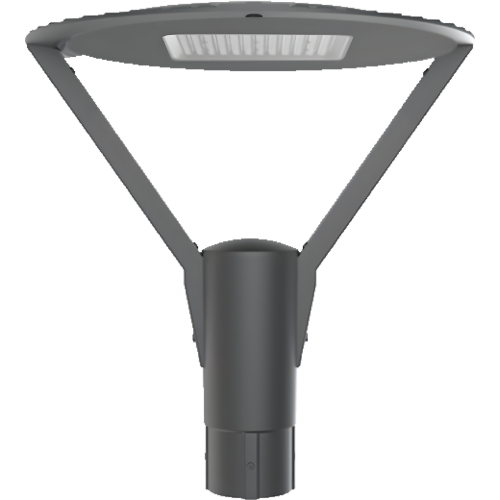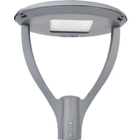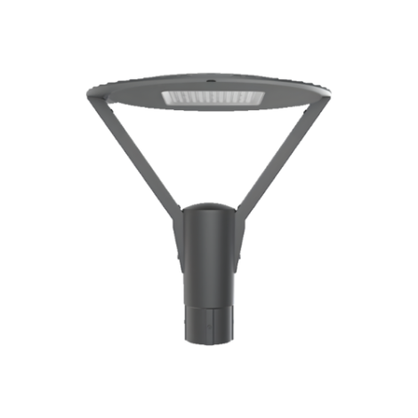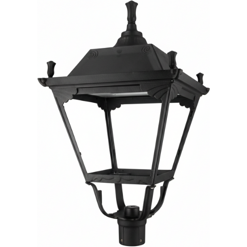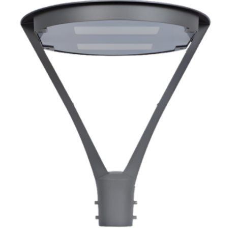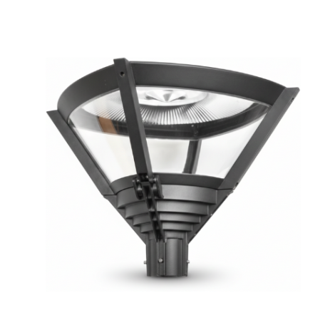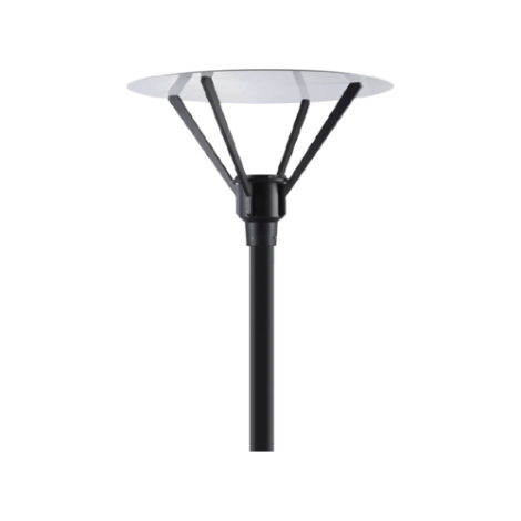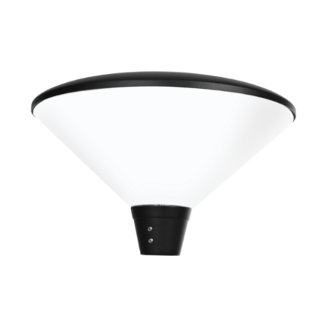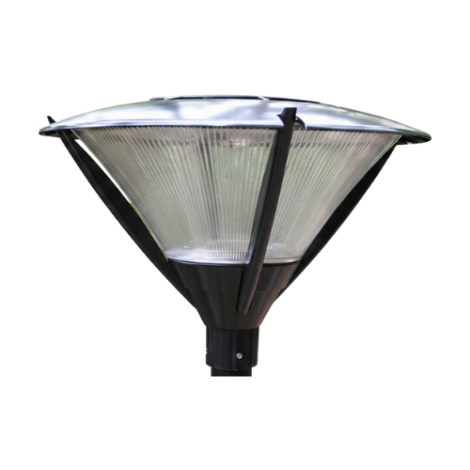 The parklight post top is made of die cast aluminium, powder coated IP65 with clear ribbed polycarbonate lens and an indirect reflector system.